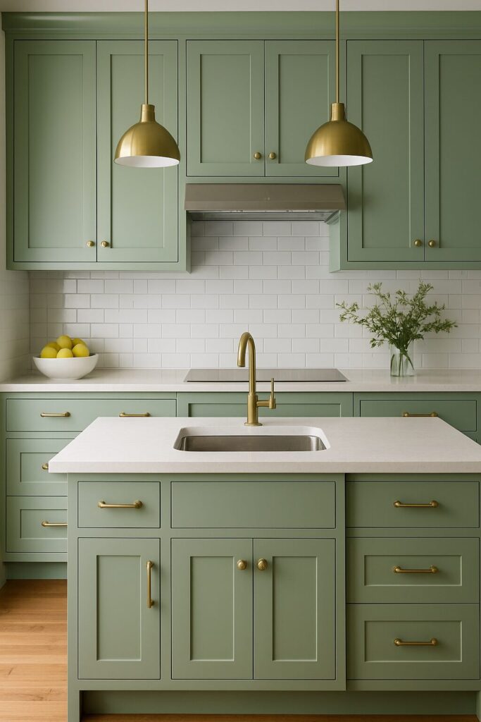 Hardware makes a huge difference in completing the look of your green cabinets. Gold and brass handles bring warmth and elegance, while matte black hardware adds contrast and modern sophistication. You can even mix finishes for a custom look — for example, black knobs with gold pendant lights. The key is to complement your cabinet tone and overall kitchen style.