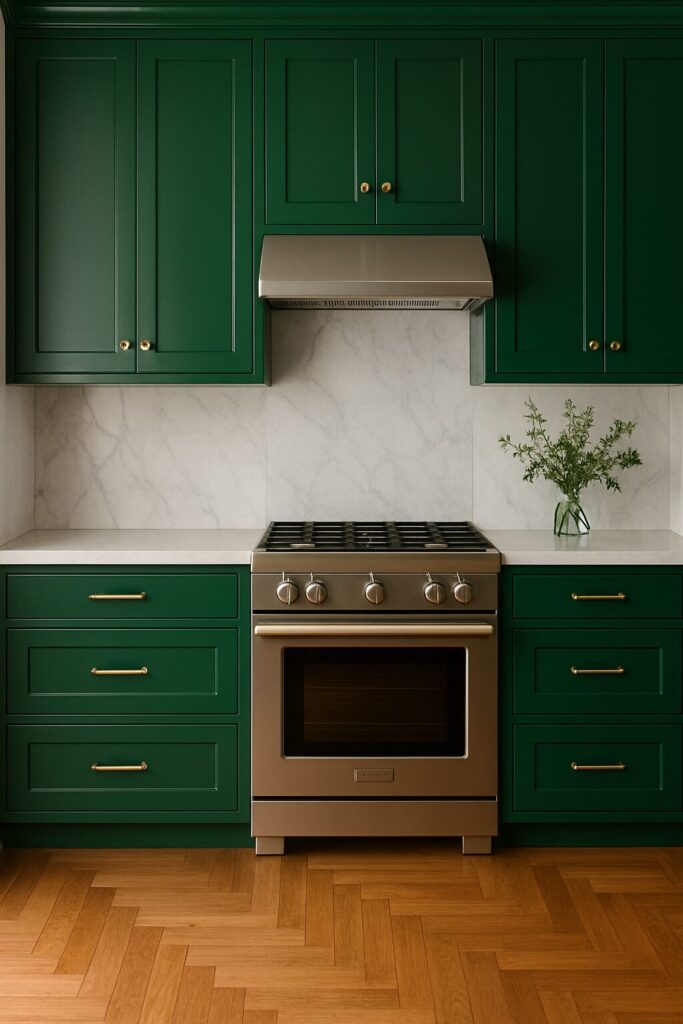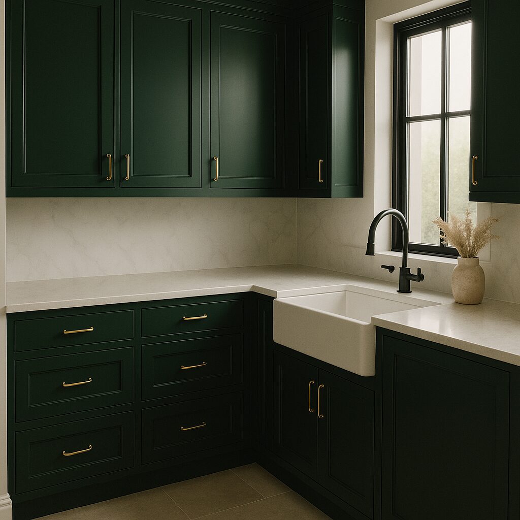 Deep forest green adds an elegant, moody atmosphere to the kitchen. Pair it with white marble or light quartz countertops for contrast. Gold or bronze accents elevate the richness of the tone, while black fixtures give a modern edge. This look works beautifully in large kitchens or open layouts where natural light can enhance the deep hues.