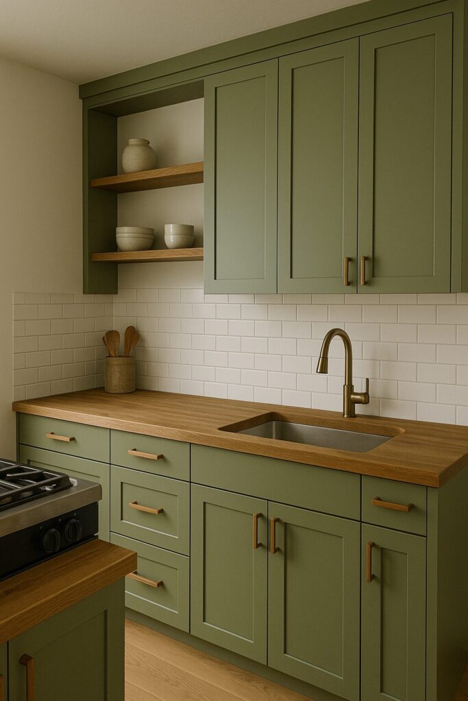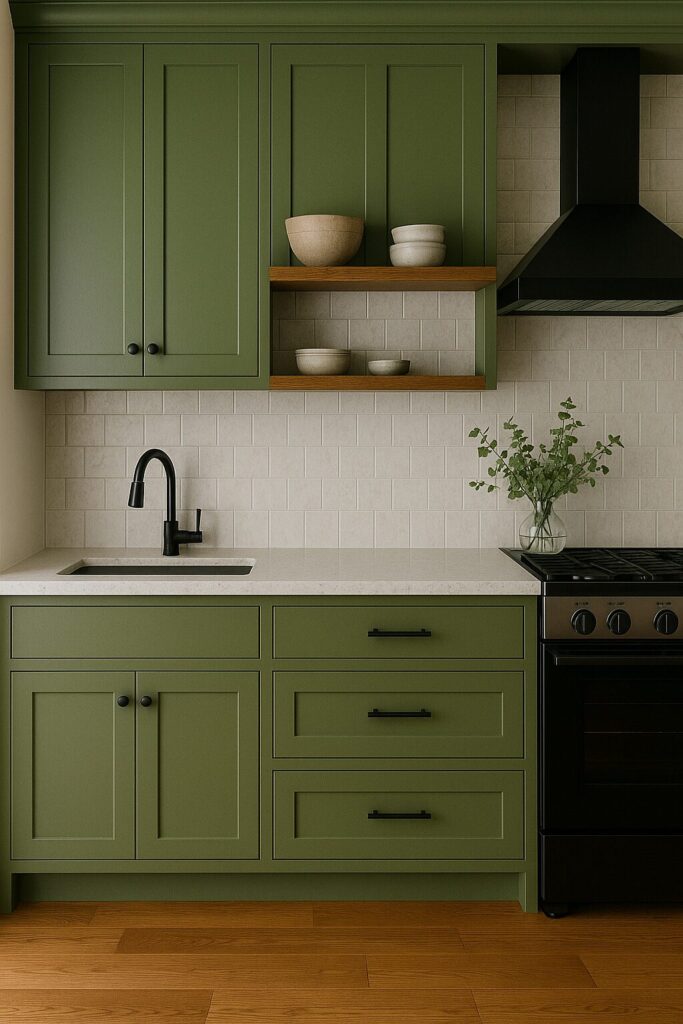 Olive green brings a grounded, natural vibe that feels both rustic and modern. It pairs beautifully with warm woods, black fixtures, and textured tiles. For a cozy farmhouse look, mix olive cabinets with open shelves and vintage décor. For a contemporary spin, add matte black hardware and minimalist lighting. Olive tones are versatile and make the kitchen feel welcoming and timeless.