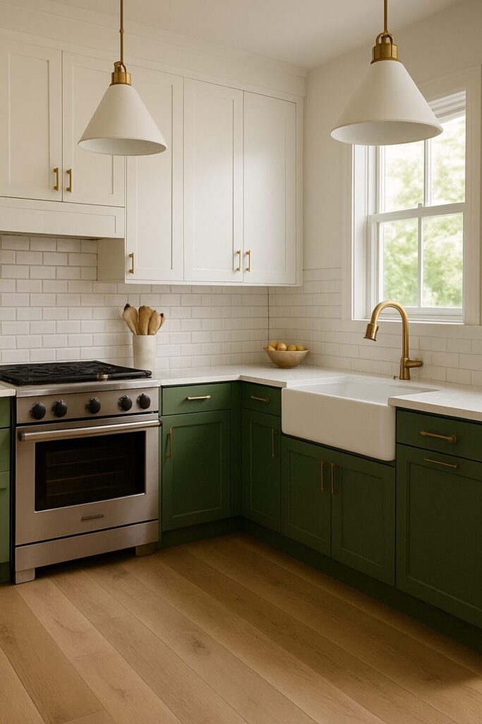 Combining green with white is a perfect way to keep the kitchen bright while adding character. Paint the lower cabinets green and keep the uppers white to create balance and visual interest. You can choose muted sage for a soft, classic look or dark forest green for bold contrast. This two-tone design adds dimension while keeping the kitchen feeling light and airy.