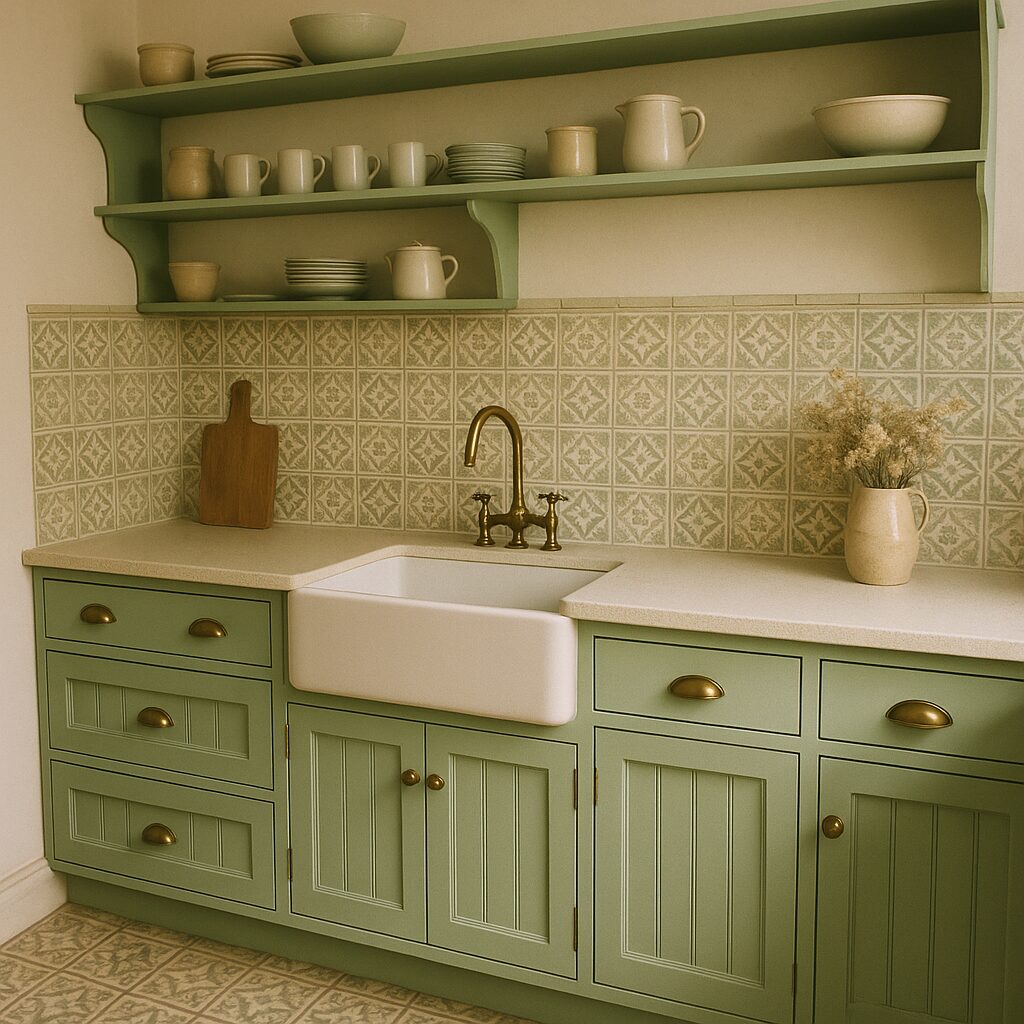For a touch of nostalgia, go for vintage-inspired green cabinets with classic details like beadboard panels or brass cup handles. Soft pastel greens or mint hues create a retro charm that pairs perfectly with patterned tiles and open shelving. If you love farmhouse or cottage-style kitchens, this idea brings warmth, character, and timeless appeal.