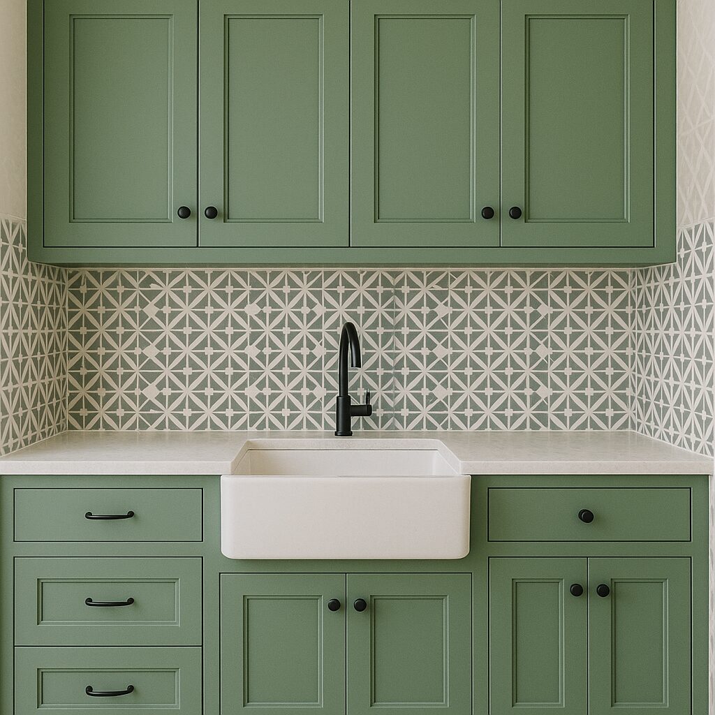 If you want to bring some personality into your kitchen, pair green cabinets with a bold backsplash. Think Moroccan tiles, geometric patterns, or subtle marble veining. The combination of color and pattern gives your kitchen a designer touch. To keep things balanced, choose complementary tones — like sage green cabinets with white and gray backsplash tiles.