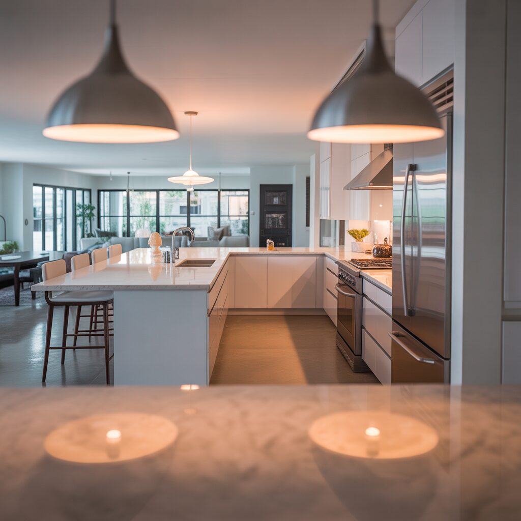 Lighting plays a big role in enhancing any kitchen layout. Combine under-cabinet lights, recessed ceiling fixtures, and pendant lights for a layered effect. Add decor elements like a patterned backsplash, plants, or minimalist artwork to bring life to the design. Smart lighting systems that adjust brightness based on time of day can make your L-shaped kitchen even more functional and cozy.