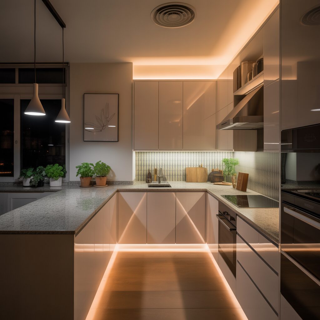 10. L-Shaped Kitchen with Smart Lighting and Decor