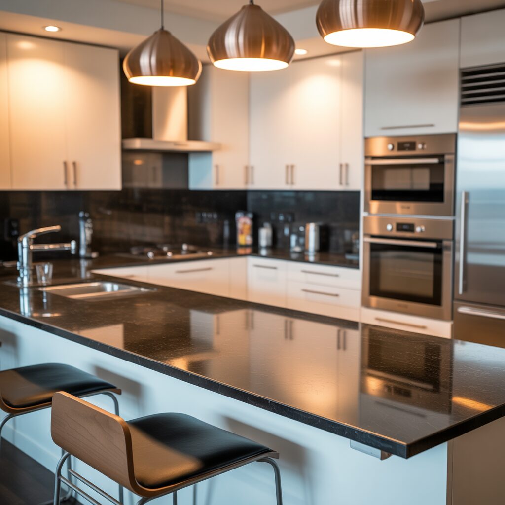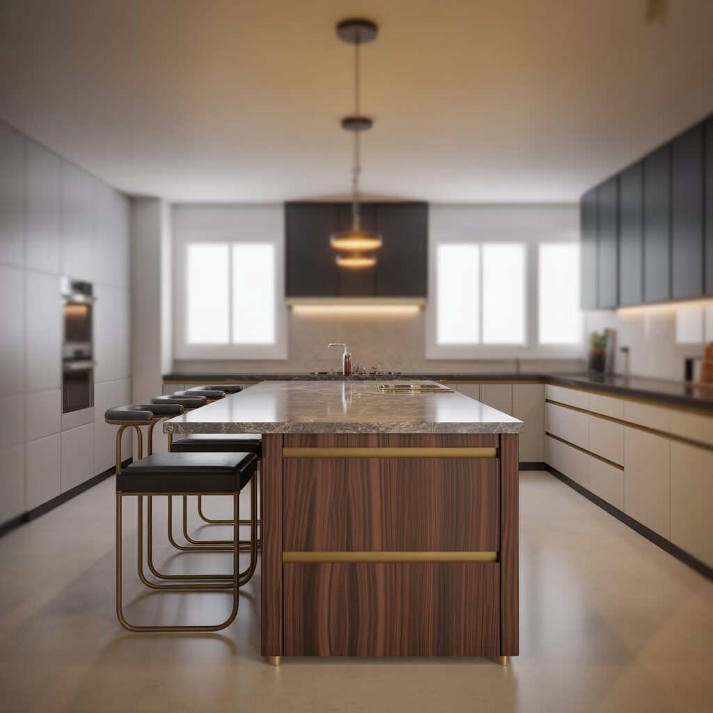 Turn your kitchen’s second leg into a breakfast counter for casual dining or quick meals. Add high stools and stylish pendant lights for a cozy yet modern touch. This setup is ideal for small families or apartments where space is limited. It’s a perfect blend of practicality and social interaction.