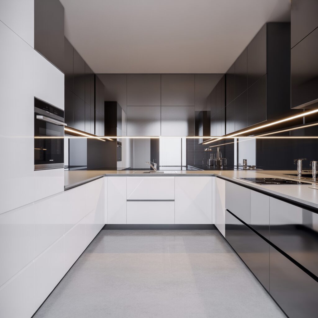 For a sleek, contemporary vibe, go with minimalist L-shaped designs featuring handleless cabinets, monochrome palettes, and built-in appliances. Integrated lighting and glossy finishes reflect light, enhancing spaciousness. Minimal clutter and clear countertops help maintain a calm, modern atmosphere that feels both stylish and efficient.