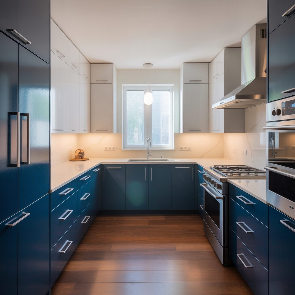 Add personality to your kitchen with two-tone cabinetry. Use lighter colors on upper cabinets and darker tones below to create contrast and depth. For example, pair navy blue with white or soft gray with natural wood. This design trend adds sophistication while preventing small kitchens from looking flat or dull.