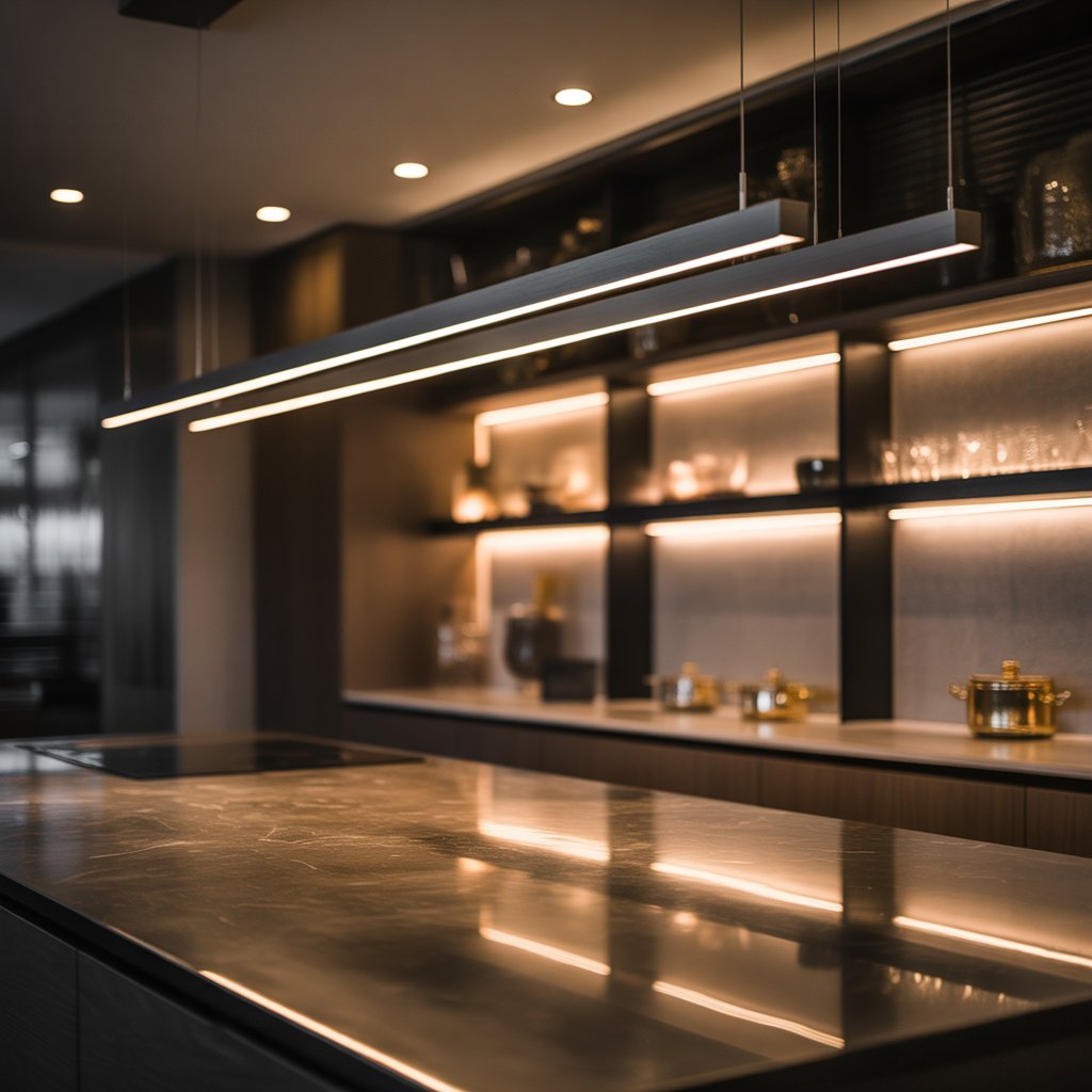 Lighting defines luxury. In high-end kitchens, it’s both functional and decorative. Layer your lighting with a mix of recessed ceiling lights, under-cabinet LEDs, and sculptural pendants. Oversized chandeliers or linear lights above the island make bold statements, while hidden strip lights behind shelves add soft, ambient glow. The right lighting design enhances materials and creates a mood that shifts effortlessly from bright and practical to warm and intimate.