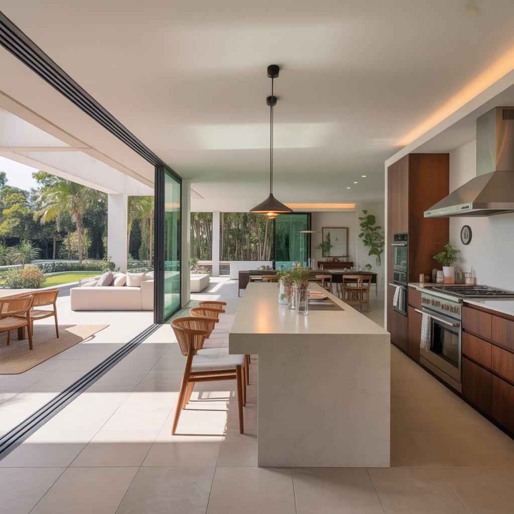 Modern luxury kitchens are built for social living. Open layouts that flow seamlessly into dining or living areas create an inviting environment for gatherings. Large sliding glass doors or panoramic windows connect indoor and outdoor spaces, enhancing natural light and openness. Combine sleek furniture, curated décor, and consistent color palettes to ensure visual unity across the entire space.