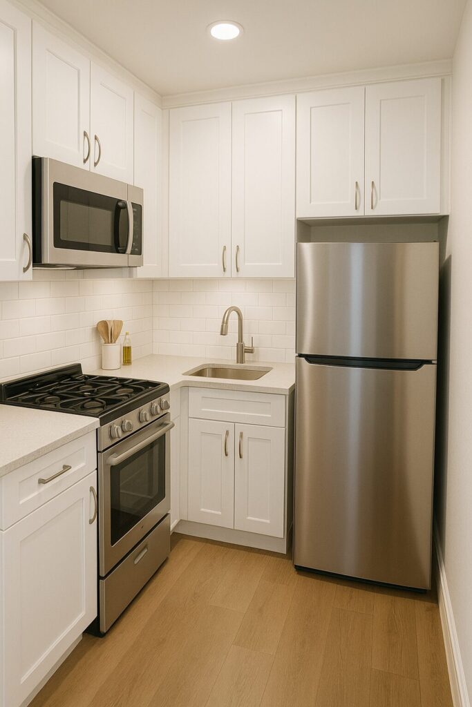 In small spaces, every item should serve more than one purpose. Consider multi-functional furniture like pull-out cutting boards, foldable tables, and extendable counters. Use built-in or compact appliances such as slim dishwashers, two-burner cooktops, and microwave-oven combos. Integrating appliances into cabinetry keeps the space seamless and organized.