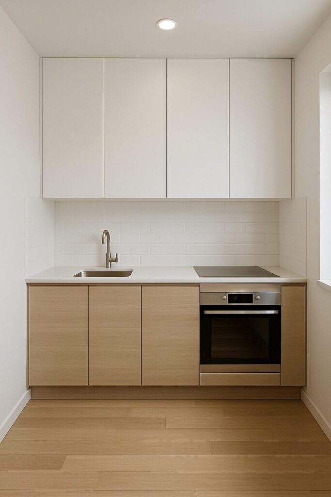 Clutter is the enemy of small spaces. Adopt a minimalist kitchen design approach by keeping countertops clear and organizing everything inside cabinets or drawers. Choose handleless cabinets or integrated pulls for a clean, modern look. Fewer visual breaks make the space look seamless and larger.