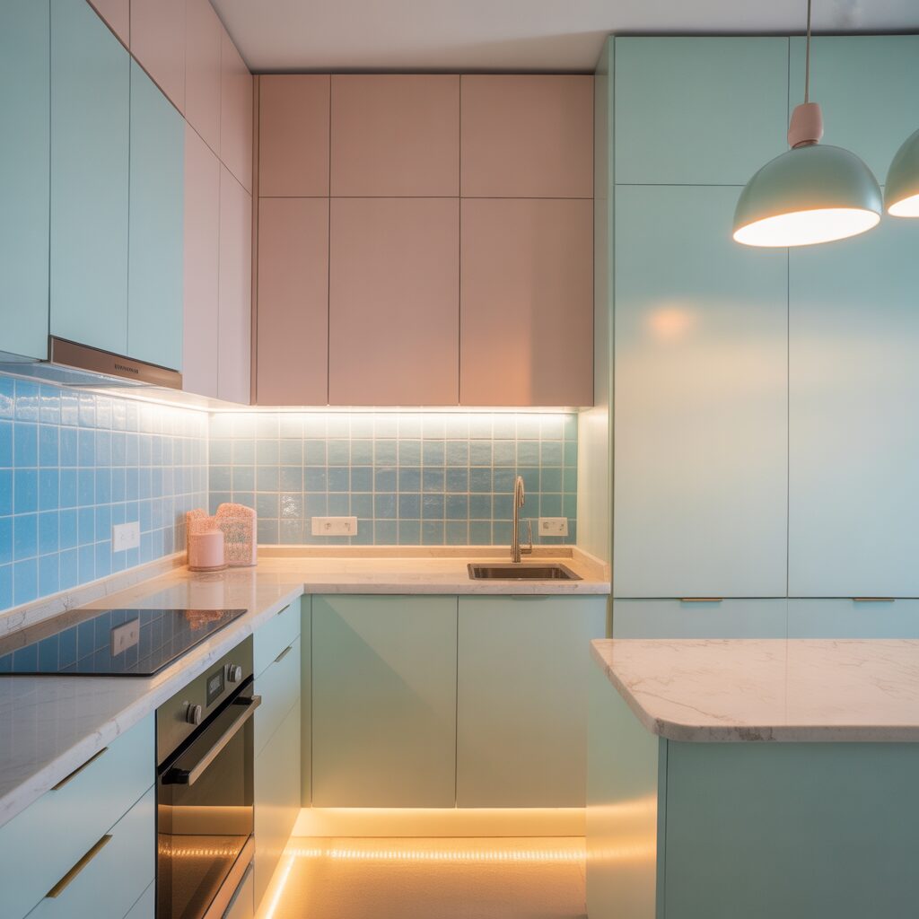 Color and lighting play major roles in how a small kitchen feels. Light pastel tones like mint, sky blue, or blush create a calm, open look. Pair these colors with under-cabinet LED strips or pendant lights to add brightness. In photo galleries, well-lit kitchens always appear larger, cleaner, and more inviting.