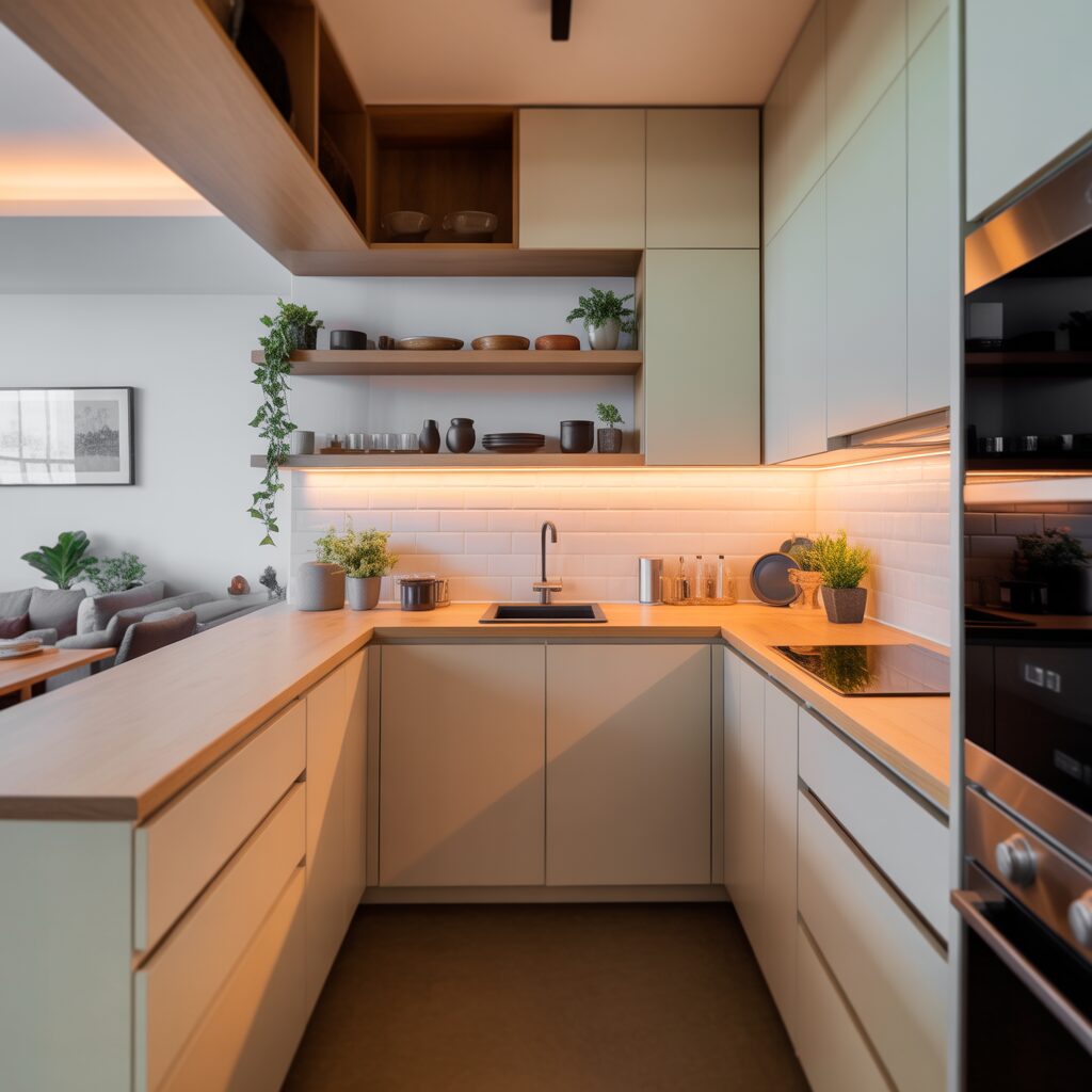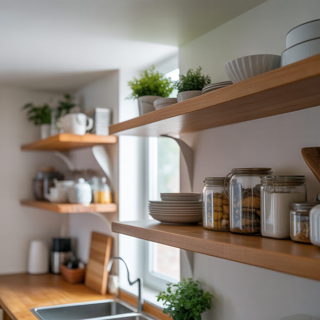 Open shelving is a favorite trend for small kitchens, offering both storage and display opportunities. It opens up the walls visually, preventing the space from feeling cramped. In galleries, you’ll see floating wooden shelves holding ceramics, plants, and glassware — giving the kitchen a personalized and airy aesthetic.