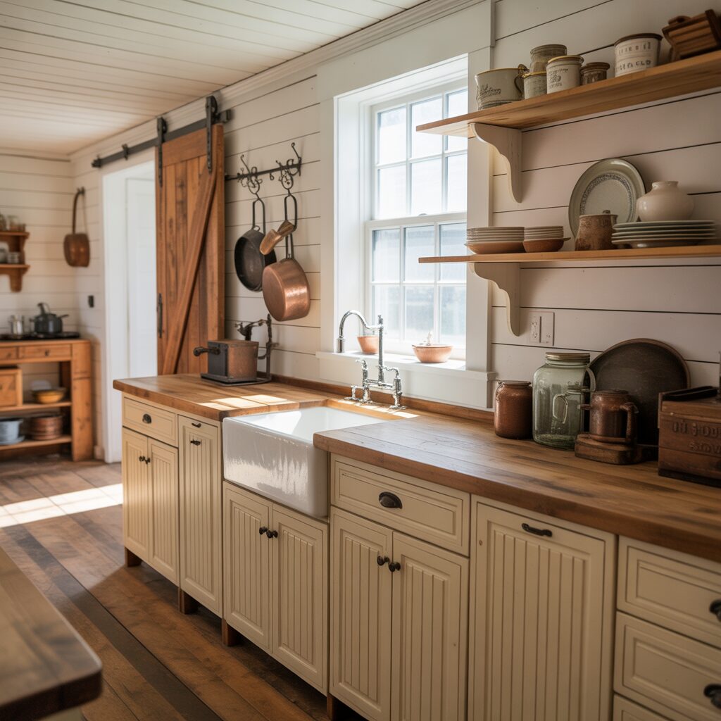 If you love rustic charm, farmhouse-style small kitchens are full of personality. Shiplap walls, vintage sinks, and open wood shelves bring warmth and character. In galleries, these kitchens often pair white or cream cabinets with black fixtures and reclaimed wood elements. Add a sliding barn door or copper pots for an authentic farmhouse feel.