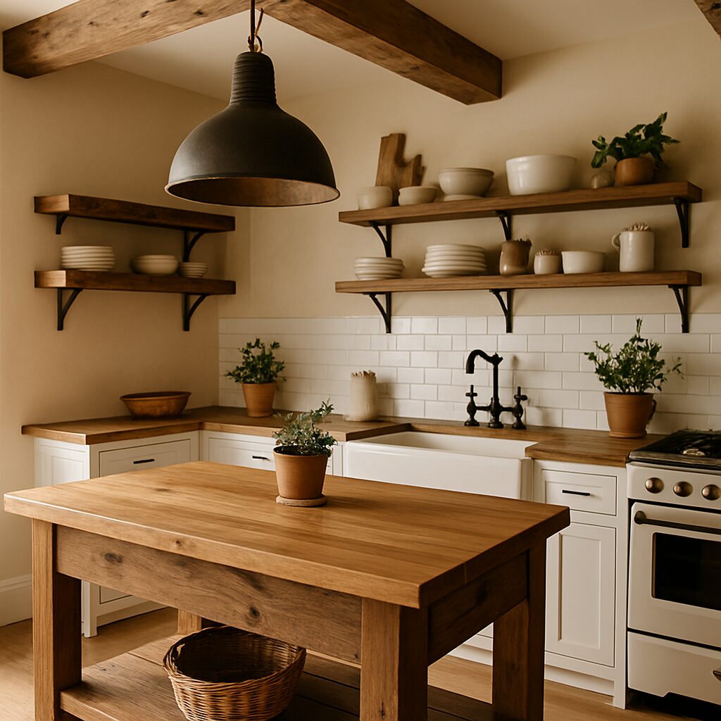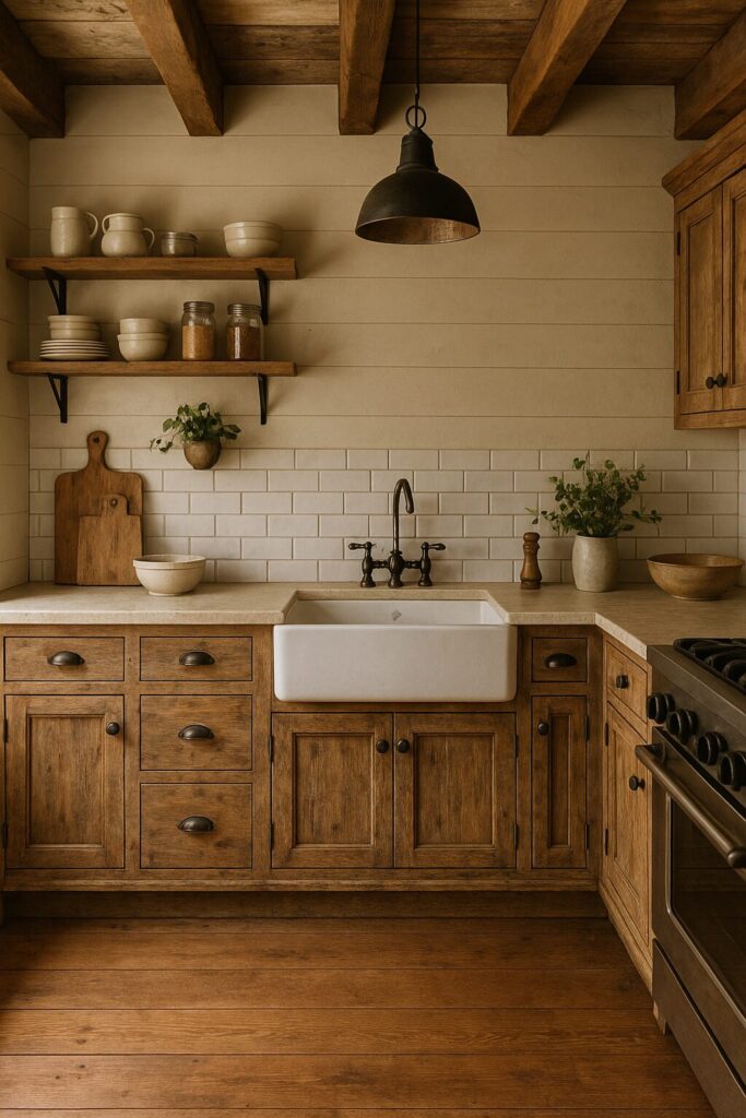 The essence of farmhouse style lies in its connection to nature. Use materials like reclaimed wood, stone, and wrought iron to give your kitchen a grounded, organic feel. Wooden beams, butcher block countertops, and open shelving made from rustic planks instantly add texture and charm. A mix of warm wood tones with neutral walls creates a cozy, lived-in look that feels timeless and inviting.
