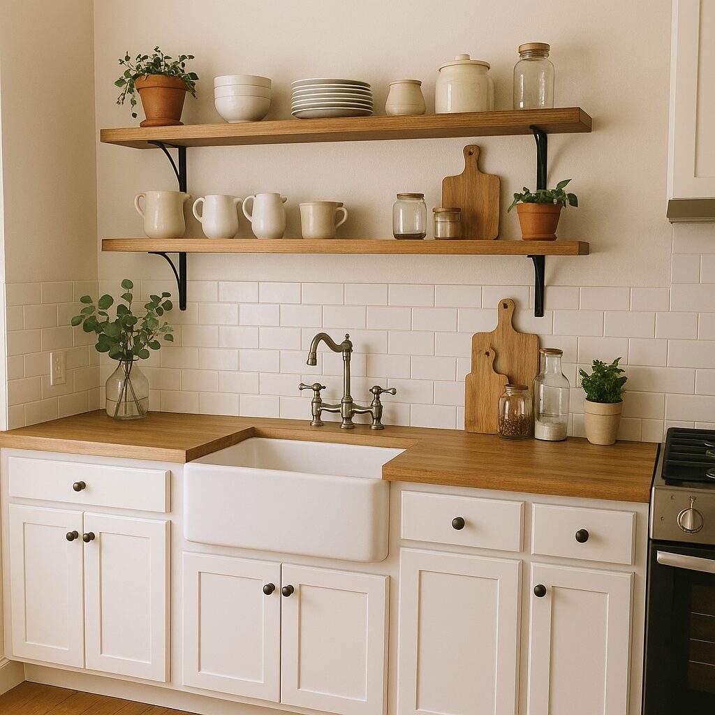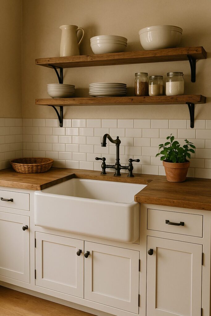 Open shelving is a hallmark of farmhouse kitchens. Instead of upper cabinets, install wooden shelves supported by black metal brackets or simple corbels. They provide easy access to everyday dishes and create opportunities to display décor — such as vintage jars, enamelware, cookbooks, and greenery. The key is to balance practicality with personality — display what you love but keep it organized for a curated, cozy feel.
