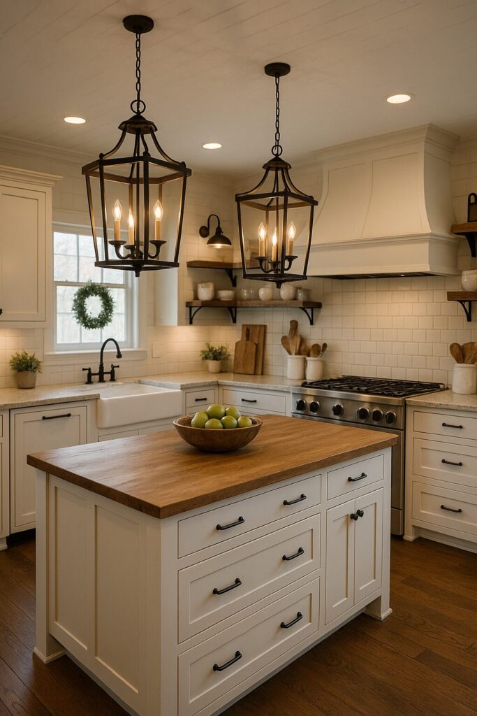 Lighting can define the mood of your farmhouse kitchen. Opt for statement lighting fixtures like wrought iron chandeliers, industrial pendant lights, or glass lanterns. Hang them above the island or dining table to draw attention to focal areas. The goal is to blend rustic and refined — fixtures that feel handcrafted but still elegant enough to complement a modern kitchen design.