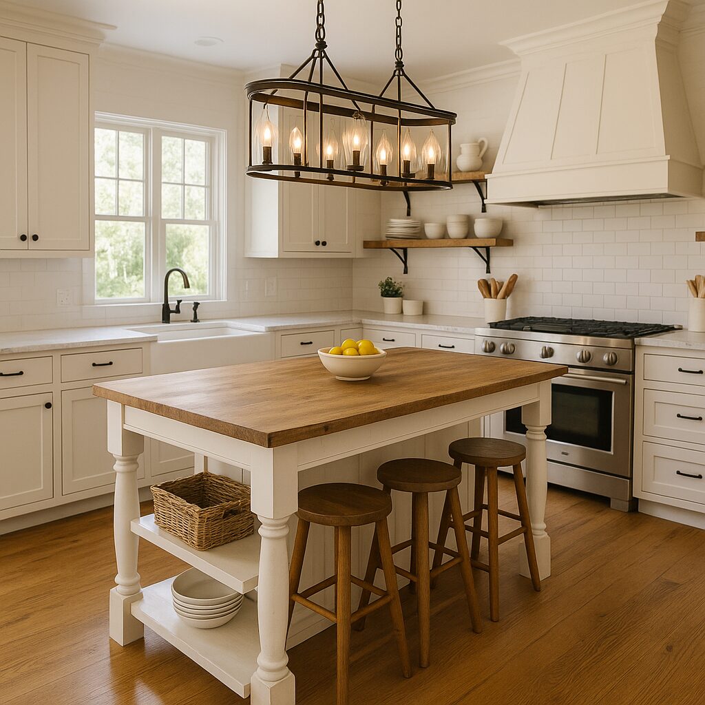 A farmhouse kitchen isn’t just a place to cook — it’s where family and friends gather. Install a sturdy farmhouse-style island with a wood or stone countertop that doubles as a prep area and dining space. Choose an island with open shelving for baskets and cookbooks or add vintage stools for an old-fashioned touch. For larger spaces, a distressed wood island or repurposed table makes a beautiful centerpiece that embodies casual charm.